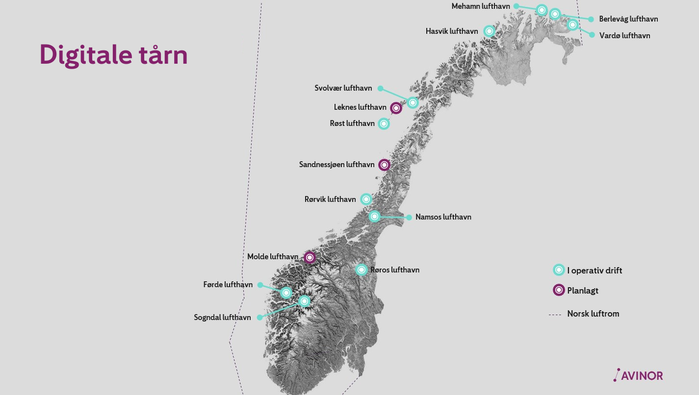 Avinor gjennomfører en rekke tiltak for å modernisere og effektivisere virksomheten og for å legge til rette for fortsatt vekst i luftfarten. Avinor Flysikring innførte digital tårntjeneste ved Røst lufthavn 19. oktober 2019 sammen med leverandørene Kongsberg Defence & Aerospace og Indra. Digitale tårn vil i første omgang rulles ut på totalt 15 lufthavner i Norge. I mai 2022 åpnet det nye Remote Towers Centre i Bodø, hvor det i dag er 14 lufthavner i operativ drift. Dette er nå verdens største senter for digitale tårn. I februar 2024 besluttet styret i Avinor å overføre seks nye tårn til Avinors digitale tårnsenter i Bodø. Det er også tidligere vedtatt at ny lufthavn Mo i Rana vil fjernstyres fra senteret i Bodø. Dermed vil antall tårn som styres fra senteret i Bodø bli til 21. Ved nye Bodø lufthavn og Kirkenes lufthavn skal det etableres digitale tårn med lokale løsninger.